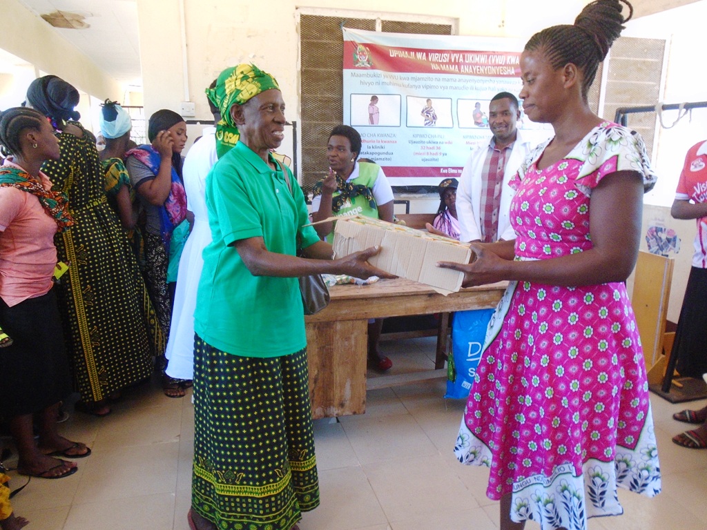 Lawrencia Machunda (kulia) kwa niaba ya akinamama na watoto wao akipokea boksi la vinywaji laini (juice) kutoka kwa Mwenyekiti wa UWT Tawi la Mwanza, zawadi hizo imetolewa na jumuiya hiyo ikiadhimisha miaka 47 ya CCM.