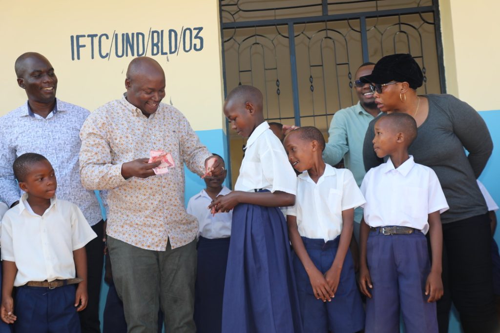 Mwenyekiti wa Kamati ya Bunge ya Tawala za Mikoa na Serikali za Mitaa (TAMISEMI), Mheshimiwa Denis Londo akiwakabidhi wanafunzi wa Shule ya Msingi Igima iliyopo Wilayani Mlimba wakati Kamati hiyo ilitembelea na kukagua ujenzi wa kukagua ujenzi wa Shule hiyo. Fedha hizo zilichangishwa na wajumbe wa Kamati hiyo na watendaji waliombatana nao.