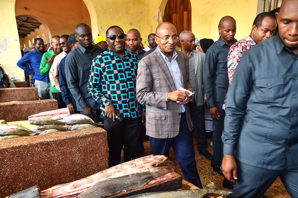 RAIS wa Zanzibar na Mwenyekiti wa Baraza la Mapinduzi Mhe.Dk.Hussein Ali Mwinyi akitembelea Marikiti Kuu ya Darajani katika Soko la Samaki, akiwa katika ziara yake katika Mkoa wa Mjini Magharibi Unguja leo 26-2-2024 na (kulia kwa Rais) Mkuu wa Mkoa wa Mjini Magharibi Unguja Mhe.Idrissa Kitwana Mustafa.(Picha na Ikulu).