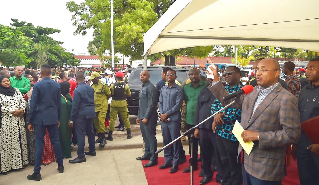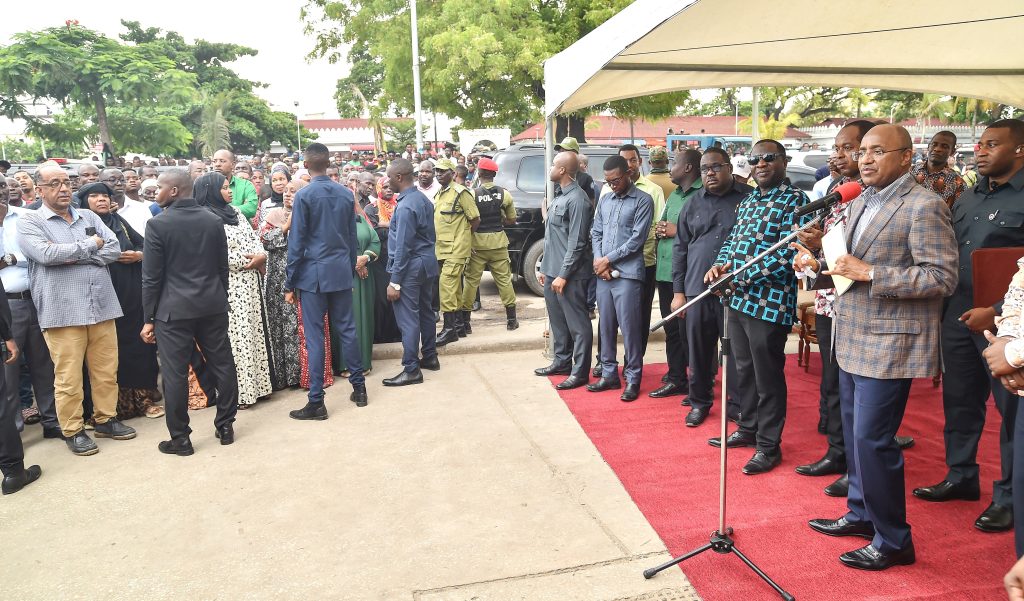 RAIS wa Zanzibar na Mwenyekiti wa Baraza la Mapinduzi Mhe.Dk.Hussein Ali Mwinyi akizungumza na Wananchi na Wafanyabiashara wa Marikiti Kuu Darajani Wilaya ya Mjini Unguja katika viwanja vya eneo hilo darajani baada ya kumaliza ziara yake katika Mkoa wa Mjini Magharibi Unguja leo 26-2-2024, ya kutembelea Masoko ya Mkoa wa Mjini Magharibi Unguja.(Picha na Ikulu)