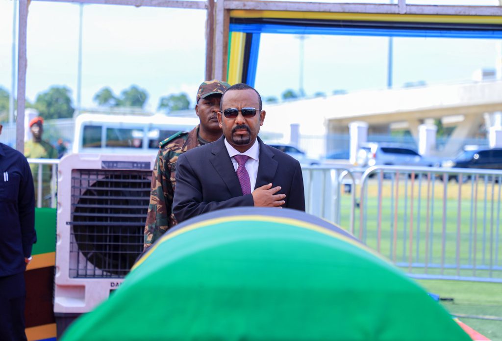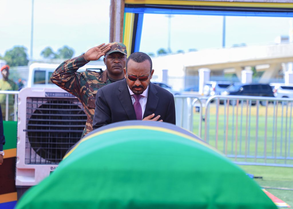Waziri Mkuu wa Ethiopia Mhe. Abiy Ahmed Ali akitoa heshima za mwisho wakati wa kuaga mwili wa Rais Mstaafu wa Awamu ya Pili wa Jamhuri ya Muungano wa Tanzania Hayati Ali Hassan Mwinyi katika Uwanja wa Uhuru Jijini Dar es salaam. Tarehe 01 Machi 2024.