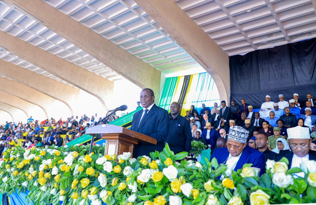Makamu wa Rais wa Jamhuri ya Muungano wa Tanzania Mhe. Dkt. Philip Mpango akitoa salamu za pole kwa familia, viongozi na wananchi kwa ujumla wakati wa kuaga mwili wa Rais Mstaafu wa Awamu ya Pili wa Jamhuri ya Muungano wa Tanzania Hayati Ali Hassan Mwinyi katika Uwanja wa Uhuru Jijini Dar es salaam. Tarehe 01 Machi 2024.
