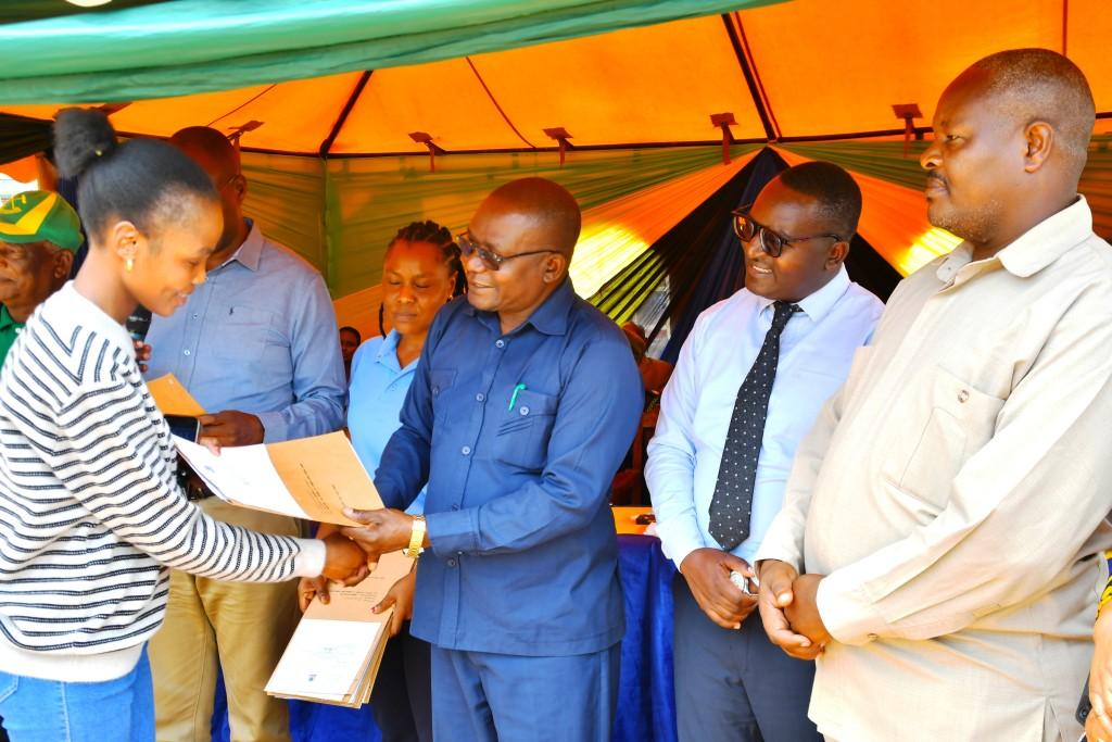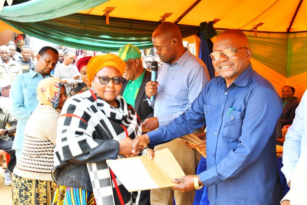 Naibu Waziri wa Ardhi Nyumba na Maendeleo ya Makazi Mhe, Geophrey Pinda akimkabidhi hati milki ya ardhi mmoja wa wananchi wa Mbulu katika mkoa wa Manyara alipokwenda kutoa hati kwa wananchi waliomilikishwa tarehe 6 Machi 2024.