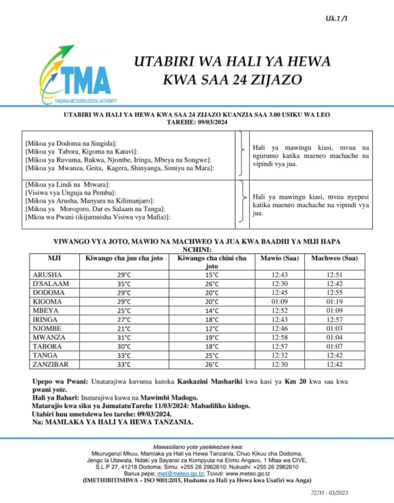 TeknolojiaUTABIRI WA HALI YA HEWA KWA SAA 24 ZIJAZO Last updated: 2024/03/09 at 2:40 PM John Bukuku 2 years ago Share SHARE John Bukuku March 9, 2024 March 9, 2024 Share this Article Facebook Twitter Email Print Previous Article WANAWAKE KATAVI WAGUSWA NA WANAOSISHI KATIKA MAZINGIRA MAGUMU Next Article RC DAR ES SALAAM AMTAKA MKANDARASI WA BARABARA YA KIMARA- MAVURUNZA KUMALIZA UJENZI