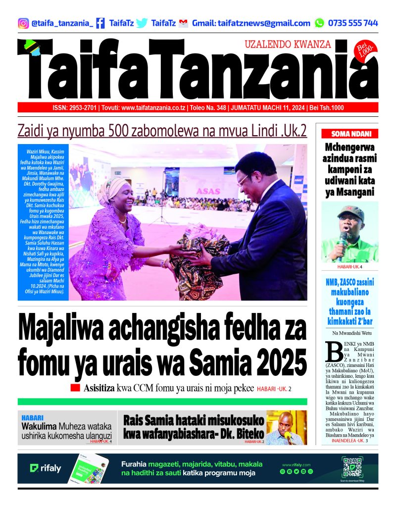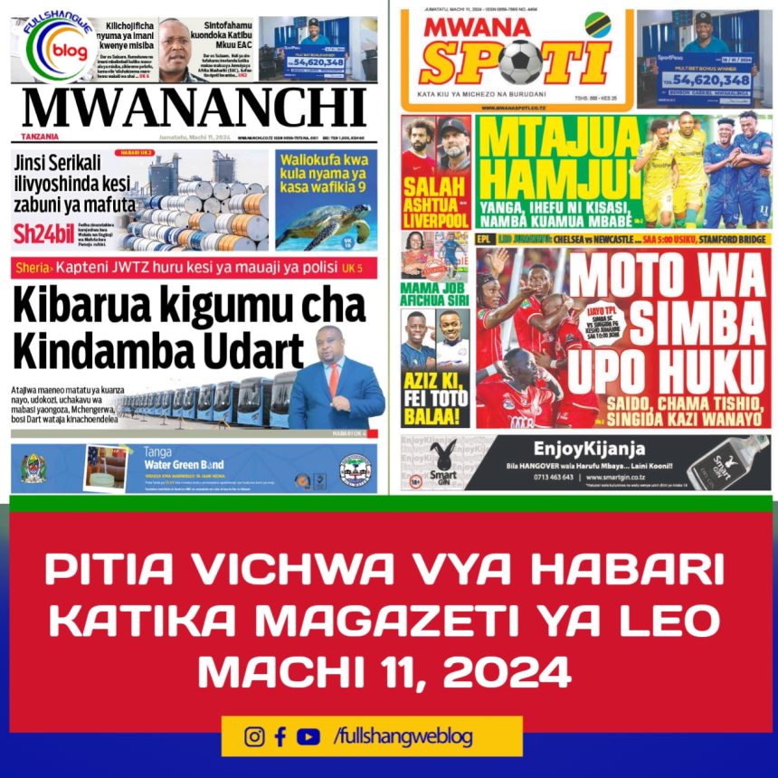 MagazetiPITIA VICHWA VYA HABARI KATIKA MAGAZETI YA LEO MACHI 11, 2024 Last updated: 2024/03/11 at 3:27 AM John Bukuku 2 years ago Share SHARE John Bukuku March 11, 2024 March 11, 2024 Share this Article Facebook Twitter Email Print Previous Article RAIS WA ZANZIBAR MHE.DK.HUSSEIN MWINYI AENDELEA NA ZIARA YAKE VIKOSI VYA SMZ Next Article UFAFANUZI KUTOKA TASAC KUFUATIA AJALI YA BOTI