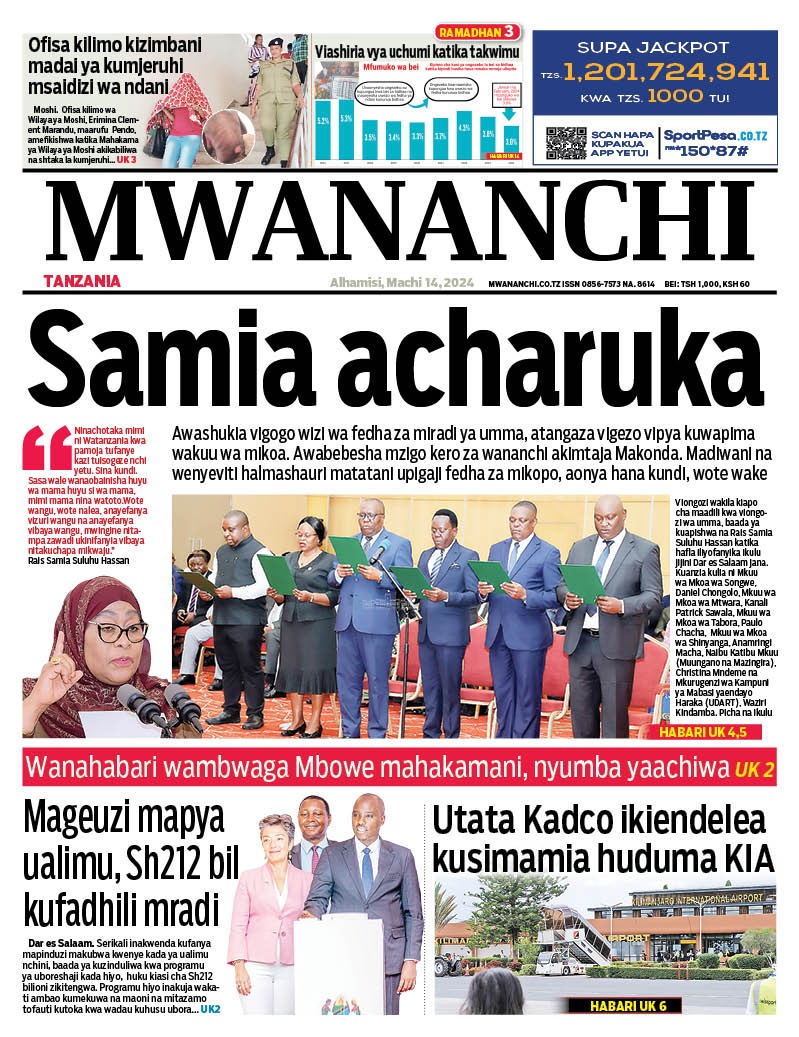 MagazetiPITIA VICHWA VYA HABARI KATIKA MAGAZETI YA LEO MACHI 14,2024 Last updated: 2024/03/14 at 1:38 AM Alex Sonna 2 years ago Share SHARE Alex Sonna March 14, 2024 March 14, 2024 Share this Article Facebook Twitter Email Print Previous Article REGROW WALETA NEEMA HIFADHI YA TAIFA RUAHA Next Article KAMATI YA BUNGE YARIDHISHWA NA MAENDELEO YA UJENZI MRADI WA UMEME MKOANI ARUSHA