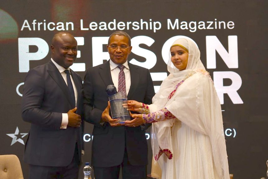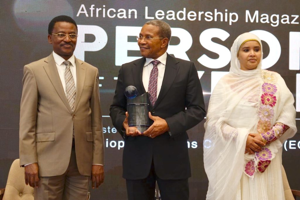 Rais Mstaafu Dk. Jakaya Mrisho Kikwete, akikabidhiwa tuzo yake na Waziri wa Mapato wa Jamhuri ya Ethiopia, Mama Aynalem Nigusie) na Mwenyekiti wa Jarida la Uongozi Afrika, Dk. Ken Giami kwenye hafla ya kila mwaka ya Tuzo za Watu Bora wa Mwaka za ALM katika Hoteli ya Ethiopian Skylight jijini Addis Ababa, Ethiopia, usiku huu.