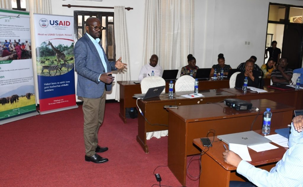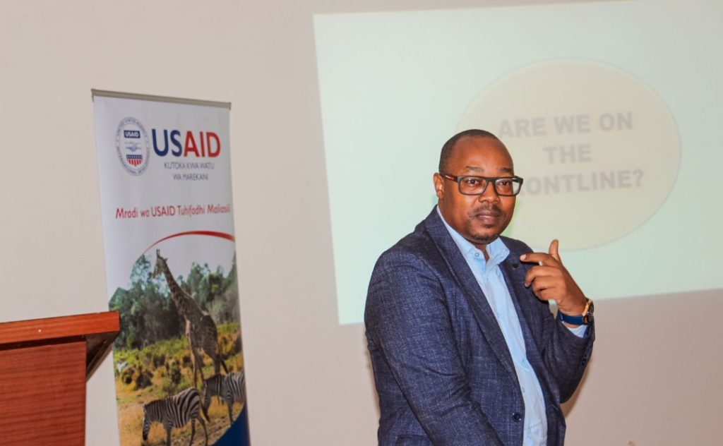 Dkt. Elikana Kalumanga, Meneja Ushirikishwaji wa Sekta Binafsi wa Mradi wa Shirika la Marekani la Maendeleo ya Kimataifa (USAID) wa Tuhifadhi Maliasili akiwasilisha mada ya uhifadhi wa wanyamapori