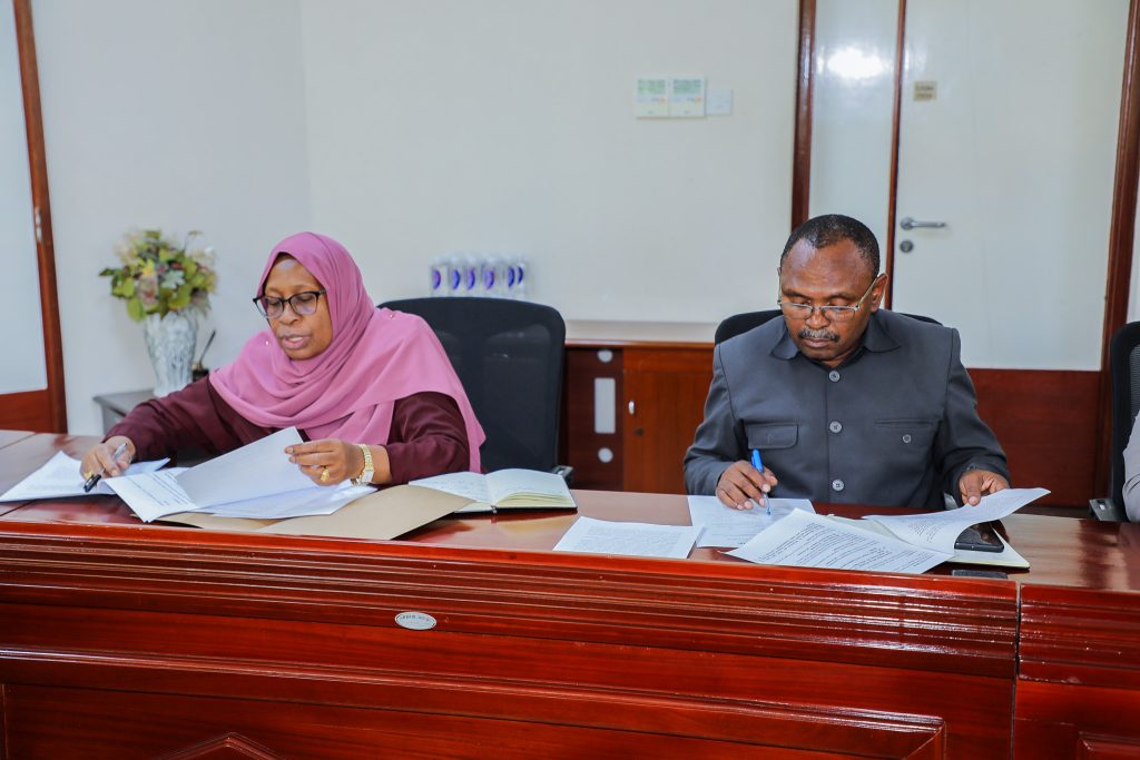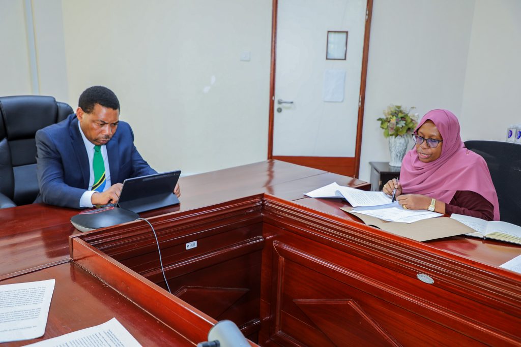 Naibu Katibu Mkuu wa Wizaraya Fedha, Bi Amina Khamis Shaaban na Afisa Mwandamizi wa Idara ya Fedha za Nje wa Wizara hiyo, Bw. John Kuchaka, wakifuatilia uwasilishwaji wa taarifa wakati wa mkutano wa Benki ya Dunia wa Jukwaa la Tatu la Kanda ya Afrika Kundi la Kwanza kwa nchi za Kipato cha Kati, ambapo Waziri wa Fedha Mhe. Dkt. Mwigulu Lameck Nchemba (Mb) alikuwa Mwenyekiti wa mkutano huo uliofanyika kwa njia ya mtandao, kutokea Jengo la Hazina (Treasury Square), jijini Dodoma.