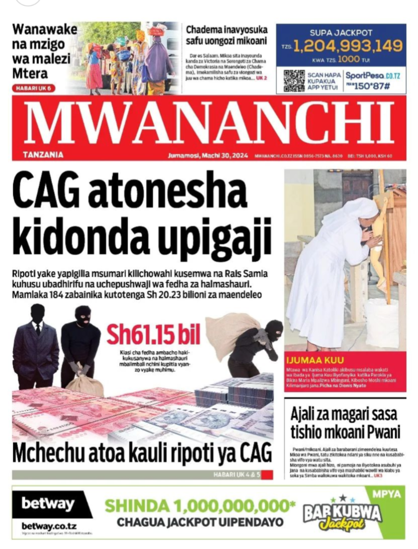 MagazetiPITIA VICHWA VYA HABARI KATIKA MAGAZETI YA LEO MACHI 30,2024 Last updated: 2024/03/30 at 9:51 AM Alex Sonna 2 years ago Share SHARE Alex Sonna March 30, 2024 March 30, 2024 Share this Article Facebook Twitter Email Print Previous Article HALMASHAURI YA BUMBULI YATANGAZA MIKAKATI YA KUPANDISHA KIWANGO CHA UFAULU Next Article TAARIFA YA POLISI KUHUSU KUSHAMBULIWA KWA RISASI