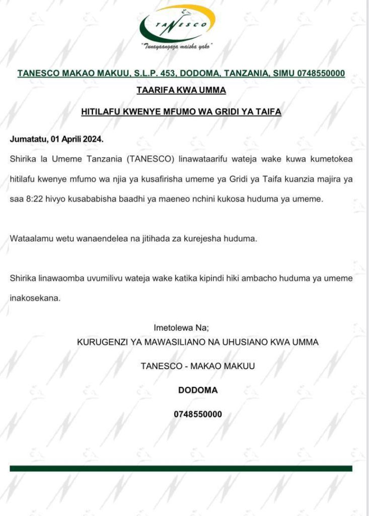MchanganyikoTANESCO YATOA TAARIFA KUHUSU HITILAFU YA UMEME KWENYE GRIDI YA TAIFA Last updated: 2024/04/01 at 7:00 AM John Bukuku 2 years ago Share SHARE John Bukuku April 1, 2024 April 1, 2024 Share this Article Facebook Twitter Email Print Previous Article BARABARA YA SONI-BUMBULI- DINDILA KOROGWE KUANZA KUFANYIWA KAZI Next Article TAMFI YAJADILI UWEZESHAJI WANAWAKE KIFEDHA