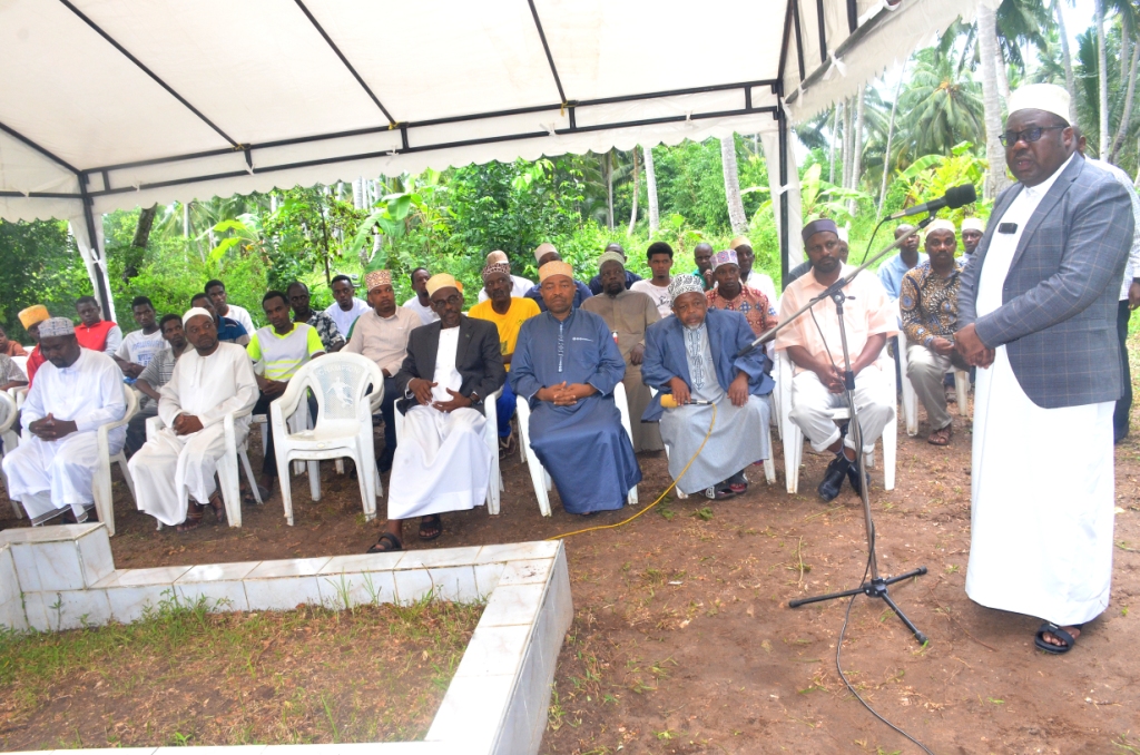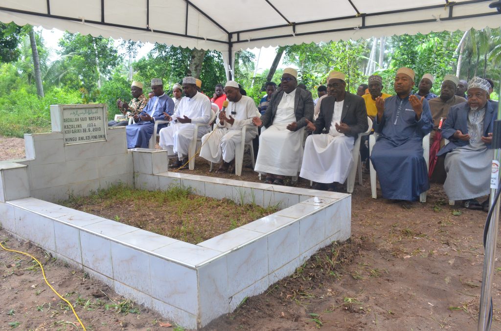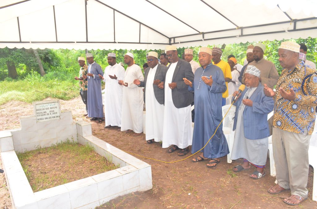 Waziri wa Nchi Ofisi ya Rais Ikulu Ali Suleiman Mrembo katikati akiwa pamoja na Viongozi mbali mbali katika Dua ya kumuombea Marehemu Meja Jenerali Mstaafu Abdalla Said Natepe katika Madhimisho ya Wiki ya Kuwaenzi Viongozi wa Kitaifa,Waasisi wa Mapinduzi ya Zanzibar na Katibu wa kwanza wa Chama cha Afro Shirazi na Siku ya kumbukumbu ya Marehemu Sheikh Abeid Amani karume hafla iliofanyika kijiji cha Mwache alale Magharibi A Zanzibar.