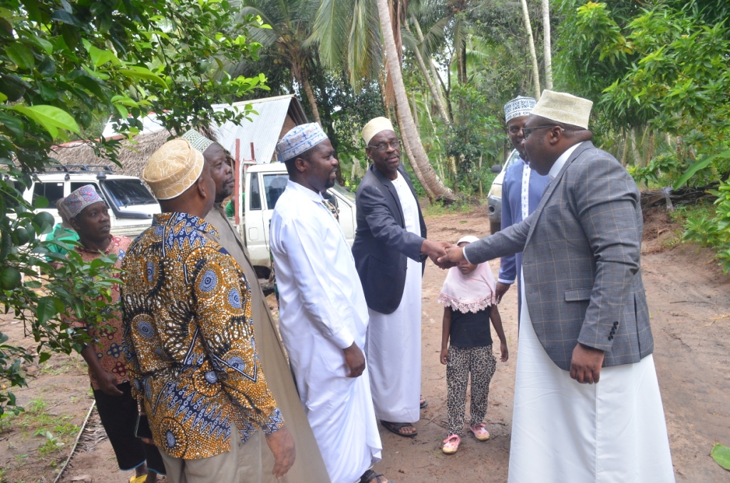 Waziri wa Nchi Ofisi ya Rais Ikulu Ali Suleiman Mrembo akisalimiana na Viongozi na wana familia mara alipowasili katika Dua ya kumuombea Marehemu Meja Jenerali Mstaafu Abdalla Said Natepe katika Madhimisho ya Wiki ya Kuwaenzi Viongozi wa Kitaifa,Waasisi wa Mapinduzi ya Zanzibar na Katibu wa kwanza wa Chama cha Afro Shirazi na Siku ya kumbukumbu ya Marehemu Sheikh Abeid Amani karume hafla iliofanyika kijiji cha Mwache alale Magharibi A Zanzibar.