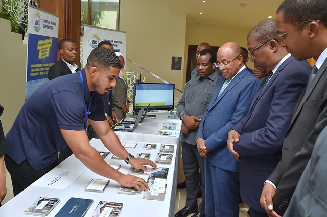 RAIS wa Zanzibar na Mwenyekiti wa Baraza la Mapinduzi Mhe.Dk.Hussein Ali Mwinyi akimsikiliza Afisa Masoko wa Shirika la Nyumba Zanzibar (ZHC)Ndg.Nurdin Hussein Mohamed,wakati akitembelea maonesho katika ukumbi wa Hoteli ya Verde Mtoni Jijini Zanzibar, wakati wa hafla ya Uzinduzi wa Taasisi ya Wasanifu,Wahandisi na Wakadiriaji, uliyofanyika leo 20-4-2024, katika ukumbi wa hoteli hiyo na (kushoto kwa Rais) Katibu Mkuu Wizara ya Ujenzi,Mawasiliano na Uchukuzi Zanzibar Dkt. Mngereza Mzee Miraji na (kulia kwa Rais) Kaimu Mkuu wa Mkoa wa Mjini Magharibi Unguja, Mkuu wa Mkoa wa Kusini Unguja.Mhe.Ayoub Mohammed Mahmoud.(Picha na Ikulu)