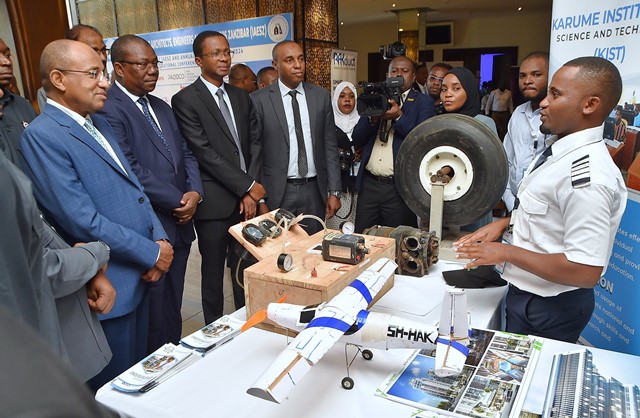 RAIS wa Zanzibar na Mwenyekiti wa Baraza la Mapinduzi Mhe.Dk.Hussein Ali Mwinyi akimsikiliza akimsikiliza Mwanafunzi wa Chuo cha Karume Taasisi ya Sayansi na Teknolojia ya Karume Zanzibar, akitowa maelezo ya ufundi wa utengenezaji wa mashine za ndege,wakati akitembelea maonesho ya Wahandisi katika ukumbi wa Hoteli ya Verde Mtoni Jijini Zanzibar, kabla ya Kuzindua Taasisi ya Wasanifu,Wahandisi na Wakadiriaji, uliyofanyika leo 20-4-2024, katika ukumbi wa hoteli hiyo na (kushoto kwa Rais) Waziri wa Ujenzi,Mawasiliano na Uchukuzi Zanzibar Mhe.Dkt.Khalid Mohamed Salum na Katibu Mkuu wa Wizara ya Ujenzi,Mawasiliano na Uchukuzi Zanzibar Dkt.Mngereza Mzee Miraji.(Picha na Ikulu)