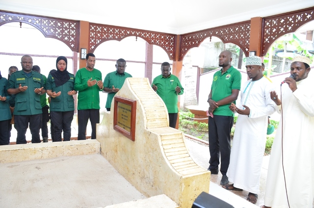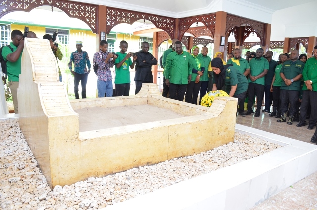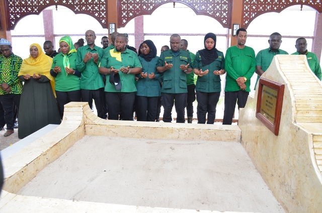 Naibu katibu Mkuu wa Umoja wa vijana (UVCCM) Zanzibar Abdi Mahmoud Abdi, Katibu Mkuu UVCCM Jocate Urban Mwegelo na viongozi mbalimbali wa Chama cha Mapinduzi wakiomba dua katika kaburi la Rais wa kwanza wa Serikali ya Mapinduzi ya Zanzibar marehemu sheikh Abeid Amani Karume huko Kisiwandui Mjini Unguja.