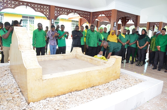 Naibu katibu Mkuu wa umoja wa vijana (UVCCM) Zanzibar Abdi Mahmoud Abdi akiweka shada la maua katika kaburi la Rais wa kwanza wa Serikali ya Mapinduzi ya Zanzibar marehemu sheikh Abeid Amani Karume huko Kisiwanduwi alipofanya ziara ya kwanza mara baada ya kuteuliwa kushika nyadhifa hiyo hivi karibuni.
