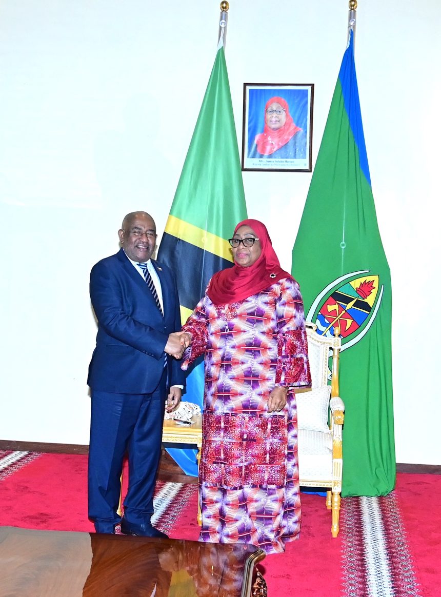 Rais wa Jamhuri ya Muungano wa Tanzania Mhe. Samia Suluhu Hassan akisalimiana na kuzungumza na Rais wa Comoro Mhe. Azali Assoumani Ikulu Jijini Dar es Salaam tarehe 26 Aprili, 2024.