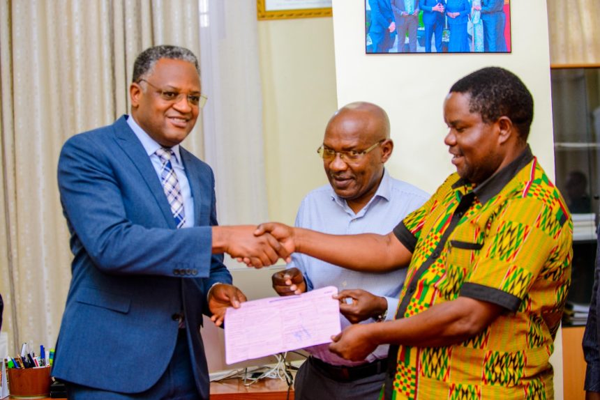 Katibu Mkuu Ofisi ya Waziri Mkuu,Sera Bunge na Uratibu,Dkt Jim Yinazi(kushoto) akipokea msaada wa 13.7m/- kutoka kwa Mratibu Mkuu wa Kundi la Viongozi Tanzania Benjamin Thompson(kulia) kwa ajili ya waathirika wa mafuriko ya Hanang,huku mmoja wa Wanachama wa kundi hilo Mhandisi Archard Kato(katikati) akishuhudia.