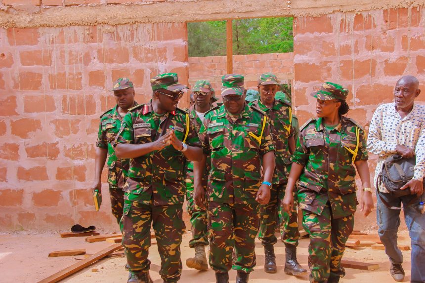 Mkuu wa Tawi la Utawala JKT, Brigedia Jenerali Hassan Mabena,akikagua maendeleo ya ujenzi wa Mahanga mara baada ya kuweka jiwe la Msingi ujenzi wa Mahanga ya Vijana katika kikosi cha 824 KJ Kanembwa,Wilayani Kakonko Mkoani Kigoma.