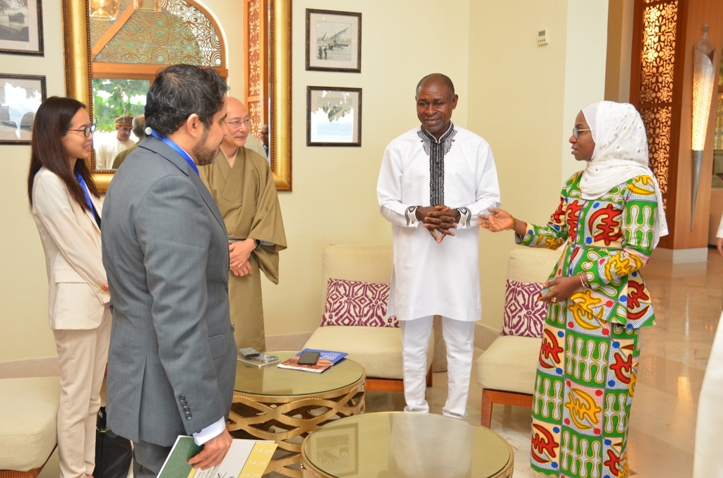 Waziri wa elimu na mafunzo ya amali Zanzibar Mhe.Lela Mohammed Mussa akizungumza Jambo na Balozi WA Saudia Nchini Tanzania Yahya Bin Ahmad Okeish (wakwanza kushoto), Mwakilishi wa UNESCO Nchini Tanzania Michel Toto (kulia Kwa waziri Lela) na Balozi wa japan Nchini Tanzania Yusushi Msawa wakati alipofika Park khayat kufungua warsha ya kujadili mradi wa kulitengeneza upya jengo lililokua la sinema(majestic ) na kuwa kituo kukuu cha utamaduni Zanzibar.
