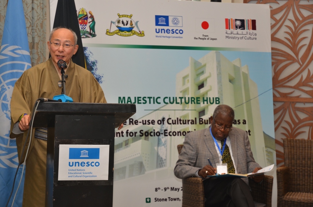 Balozi wa Japan Nchini Tanzania Yusushi Msawa akizungumza katika warsha ya kujadili mradi wa kulitengeneza upya jengo lililokua la sinema (majestic) na kuwa kituo kukuu cha utamaduni baada ya matengenezo hayo,warsha hiyo ilifanyika Park khayt Mjini Unguja