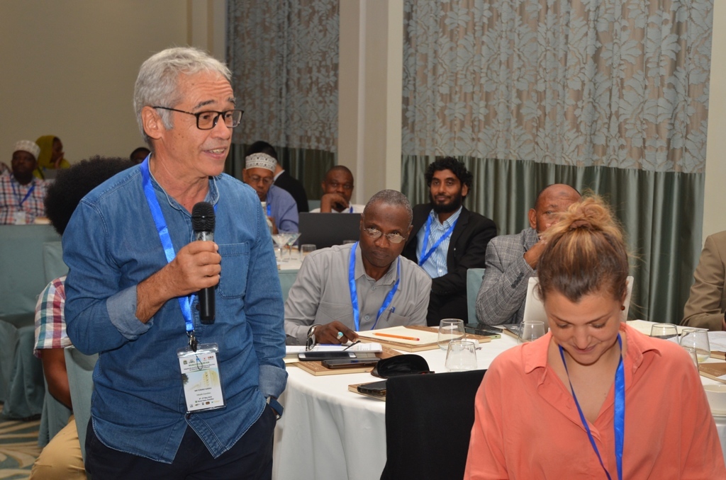 Mwakilishi wa Shirika la Elimu, Sayansi na Utamaduni la Umoja wa Mataifa UNESCO Nchini Tanzania Michel Toto akizungumza katika warsha ya kujadili mradi wa kulitengeneza upya jengo lililokua la sinema (majestic) na kuwa kituo kukuu cha utamaduni baada ya matengenezo hayo,warsha hiyo ilifanyika Park khayyt Mjini Unguja