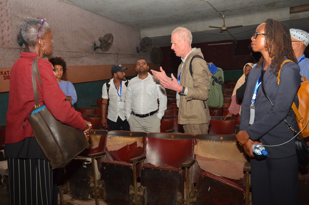 Timu ya wataalamu wa ukarabati wa jengo la sinema magestic wakikagua jengo hilo liliopo vuga Mjini Zanzibar.