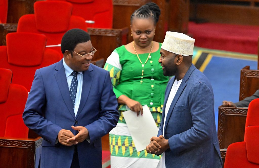 Waziri Mkuu, Kassim Majaliwa akizungumza na Waziri wa Mambo ya Ndani ya Nchi , Mhandisi Hamadi Masauni, bungeni jijini Dodoma, Mei 10, 2024. Katikati ni Naibu Waziri wa Habari, Mawasiliano na Teknolojia ya Habari, Mhandisi Maryprisca Mahundi. (Picha na ofisi ya Waziri Mkuu)