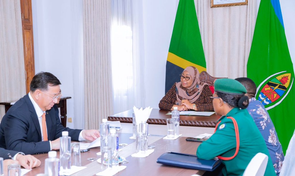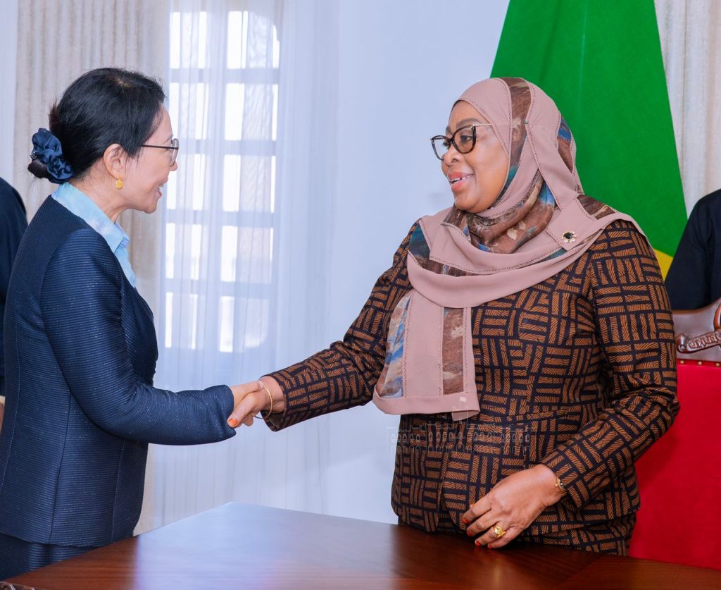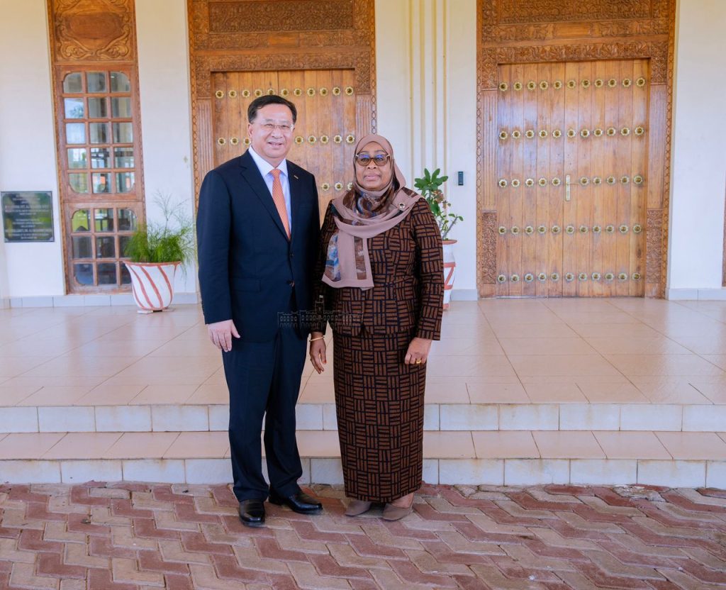 Rais wa Jamhuri ya Muungano wa Tanzania Mhe. Samia Suluhu Hassan akisalimiana na Balozi wa China nchini Tanzania Ndugu Chen Mingjian kabla ya kuanza kwa mazungumzo yaliowahusisha Viongozi wa China Railway Construction Corporation (CRCC) na China Civili Engineering Construction (CCECC) Ikulu Ndogo Tunguu Zanzibar tarehe 11 Mei, 2024.