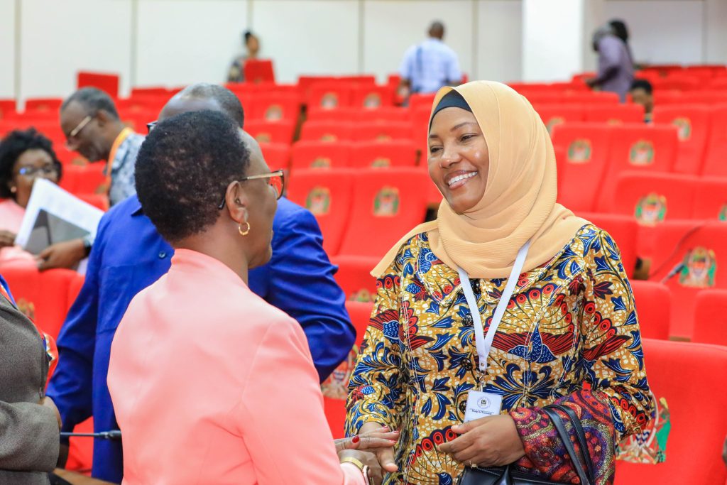 Katibu Mkuu wa Wizara ya Ujenzi, Balozi Mhandisi Aisha Amour akizungumza na Balozi Liberatha Mulamula, mara baada ya Semina kuhusu mikakati ya kuongeza ushiriki wa Wakandarasi na Washauri Elekezi kwenye miradi ya ujenzi iliyoandaliwa na Wizara ya Ujenzi kwa Waheshimiwa Wabunge, iliyofanyika jijini Dodoma