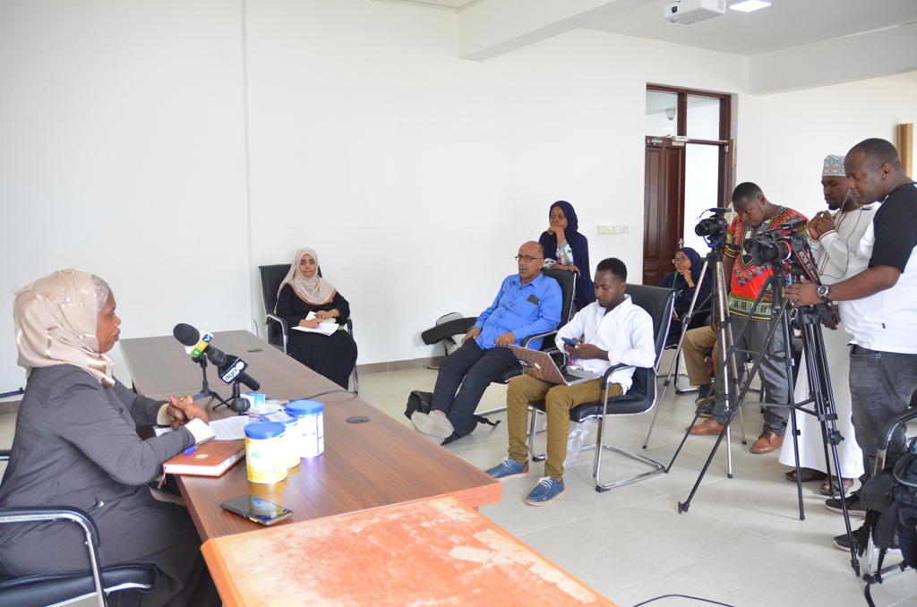Kaimu Mkurugenzi idara ya udhibiti usalama wa chakula Khadija Ali Sheha akitoa taarifa kwa umma kuhusiana na kusitisha matumizi na kuyaondoshwa sokoni bidhaa maziwa ya kopo ya watoto aina ya INFACARE 1, 2 na 3 kutokana na uwepo wa maneno yanayosomeka hairuhusiwi kuuzwa tena Tanzania “NOT FOR RESALE IN TANZANIA” juu ya makopo ya bidhaa hiyo,hafla iliyo ZFDA Mombasa Zanzibar