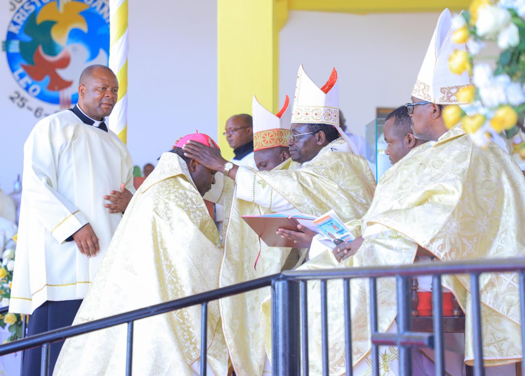 Mhashamu Askofu Msaidizi wa Jimbo Kuu Katoliki Dodoma Wilbroad Kibozi akiwekwa Wakfu na kukabidhiwa mavazi na fimbo ya kiaskofu katika sherehe iliyofanyika Kituo Cha Hija Miyuji Mbwanga mkoani Dodoma tarehe 12 Mei 2024.