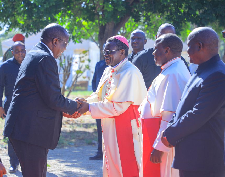 Makamu wa Rais wa Jamhuri ya Muungano wa Tanzania Mhe. Dkt. Philip Mpango akisalimiana na Mhashamu Askofu Msaidizi wa Jimbo Kuu Katoliki Dodoma Wilbroad Kibozi wakati alipowasili Kituo Cha Hija Miyuji Mbwanga mkoani Dodoma kushiriki Ibada ya Kuwekwa Wakfu Askofu huyo tarehe 12 Mei, 2024