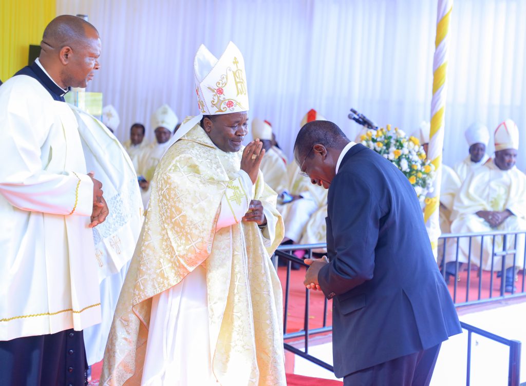 Makamu wa Rais wa Jamhuri ya Muungano wa Tanzania Mhe. Dkt. Philip Mpango akiagana na Mhashamu Askofu Msaidizi wa Jimbo Kuu Katoliki Dodoma Wilbroad Kibozi mara baada ya ya kumalizika kwa Ibada ya kuwekwa Wakfu Askofu huyo iliyofanyika Kituo Cha Hija Miyuji Mbwanga mkoani Dodoma tarehe 12 Mei 2024.