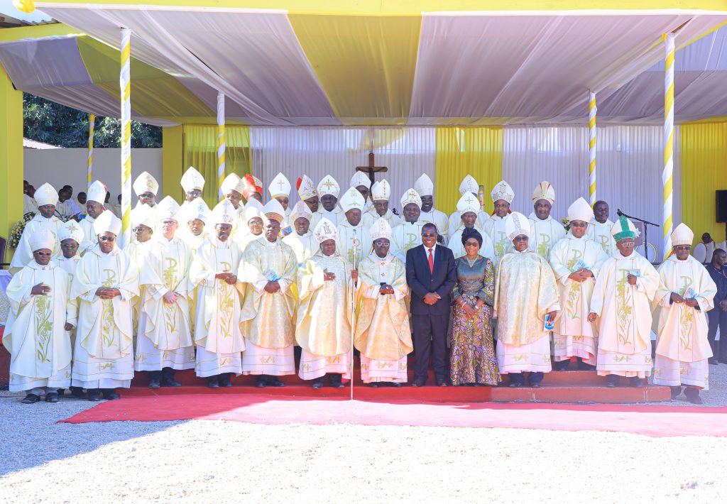 Makamu wa Rais wa Jamhuri ya Muungano wa Tanzania Mhe. Dkt. Philip Mpango na Mwenza wake Mama Mbonimpaye Mpango wakiwa katika picha ya pamoja na Maaskofu mbalimbali wa Kanisa Katoliki mara baada ya kumalizika kwa Ibada ya kuwekwa Wakfu Mhashamu Askofu Msaidizi Wilbroad Kibozi iliyofanyika Kituo Cha Hija Miyuji Mbwanga mkoani Dodoma tarehe 12 Mei 2024.