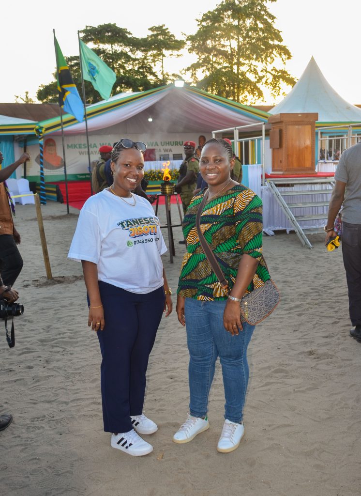 Meneja wa TANESCO Mkoa wa Kinondoni Kusini Mhandisi Florence Mwakasege pamoja na Afisa Uhusiano Huduma kwa Wateja TANESCO Mkoa Kinondoni Kusini Samia Chande wakishika Mwenge wa Uhuru 2024 katika Uwanja wa Barafu Mburahati, Dar es Salaam.