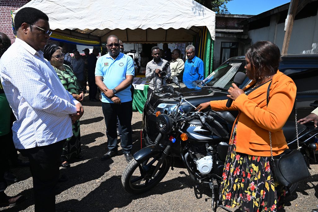 Waziri Mkuu, Kassim Majaliwa na mkewe Mama Mary Majaliwa wakimsikiliza, mkulima wa zao la Kakao, Bupe Basangula ambaye amenunua pikipiki yenye thamani ya sh, 3, 700/= alizozipata baada ya kuuza zao hilo. Mheshimiwa Majaliwa alikuwa katika viwanja vya ghala la Kakao kwenye kijiji cha Ipinda wilayani Kyela, Mei 12, 2024. (Picha na Ofisi ya Waziri Mkuu)