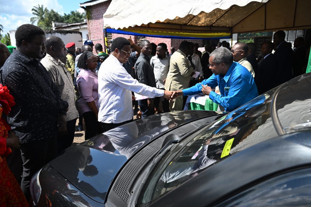 Waziri Mkuu, Kassim Majaliwa akimpongeza mkulima wa zao la Kakao, Mzee Yohana Abel ambaye amefanikiwa kununua gari aina ya Toyota Rumio lenye thamani ya sh. milioni 21 alizozipata kutokana na mauzo ya zao hilo. Mheshimiwa Majaliwa alikuwa katika viwanja vya ghala la Kakao kwenye kwenye kijiji cha Ipinda wilayani Kyela, Mei 12, 2024. Kushoto ni Naibu Waziri wa Kilimo, David Silinde. (Picha na Ofisi ya Waziri Mkuu)