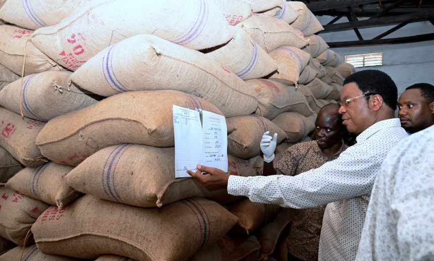 Waziri Mkuu Kassim Majaliwa akitazama magunia yenye Kakao alipokagua ghala la Kakao kwenye kijiji cha Ipinda wilayani Kyela akiwa katika ziara ya mkoa wa Mbeya, Mei 12, 2024. (Picha na Ofisi ya Waziri Mkuu)
