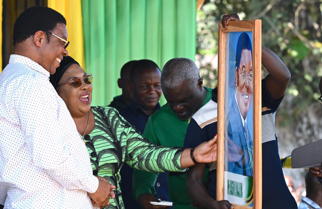 Waziri Mkuu Kassim Majaliwa na Mkewe Mary Majaliwa wakifurahia picha ya Waziri Mkuu waliyozadiwa na mchoraji wa picha hiyo Charles Vitus Maembe, wakati Waziri Mkuu alipokagua gala la Kokoa na kuzungumza na wananchi katika kijiji cha Ipinda Wilayani Kyela Mkoani Mbeya Mei 12, 2024. (Picha na Ofisi ya Waziri Mkuu)