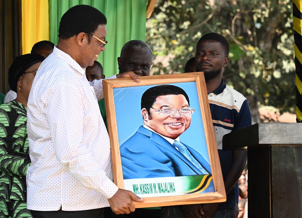 Waziri Mkuu Kassim Majaliwa akipokea zawadi ya picha yake iliyochorwa na Charles Vitus Maembe (Kulia) wakati Waziri Mkuu alipokagua gala la Kokoa na kuzungumza na wananchi katika kijiji cha Ipinda Wilayani Kyela Mkoani Mbeya Mei 12, 2024. (Picha na Ofisi ya Waziri Mkuu)
