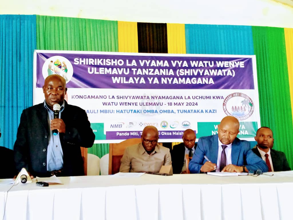 Mwenyekiti wa SHIVYAWATA Wilaya ya Nyamagana Hamza Nyamakurura akizungumza kwenye Kongamano la uchumi kwa watu wenye ulemavu