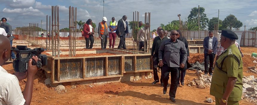 Katikati ni MKuu wa Mkoa wa Ruvuma Kanali Ahmed Abbas Ahmed akikagua mradi wa kituo Jumuishi cha huduma za Mahakama kinachojengwa eneo la Nanenane Kata ya Msamala Manispaa ya Songea kwa gharama ya shilingi bilioni kumi