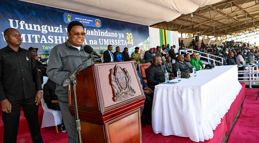 Waziri Mkuu Kassim Majaliwa akipuliza kipyenga na kurusha mpira kuashiria ufunguzi wa mashindano ya Umoja wa Michezo na Taaluma kwa shule za Msingi (UMITASHUMTA) na Sekondari (UMISSETA) katika uwanja wa Alli Hassan Mwinyi mkoani Tabora Juni 8.2024. Kushoto ni Waziri wa Nchi, Ofisi ya Rais Tawala za Miko ana Serikali za Mitaa (TAMISEMI) ambaye pia ni Mbunge wa Rufiji, Mohammed Mchengerwa. (Picha na Ofisi ya Waziri Mkuu)