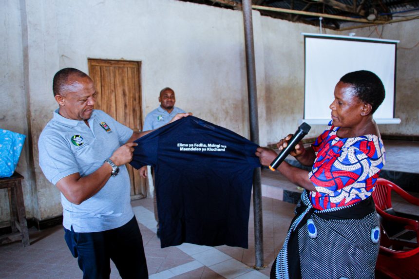 Afisa Mkuu Mwandamizi Idara ya Uendeshaji wa Sekta ya Fedha- Wizara ya Fedha, Bw. Salim Kimaro (kushoto) akimkabidhi Mjasiriamali Bi. Magreth Kainuka, fulana wakati wa utoaji elimu ya fedha katika Ukumbi wa Kijiji cha Muze Wilaya ya Sumbawanga Vijijini.