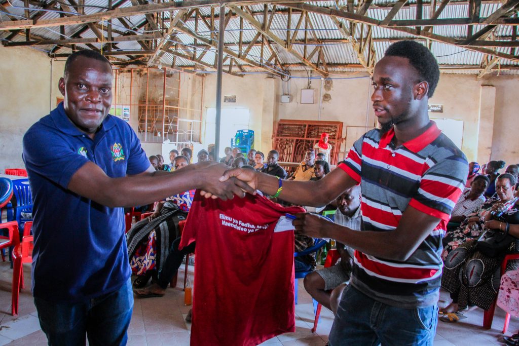 Mratibu wa Huduma Ndogo za Fedha Halmashauri ya Wilaya ya Sumbawanga, Bw. Winfred Mwamkalaba (kushoto), akimkabidhi mwanakikundi mjasiriamali Bw. Ruben Masinga, fulana wakati wa utoaji elimu ya Fedha katika Ukumbi wa Kijiji cha Muze Wilaya ya Sumbawanga Vijijini.