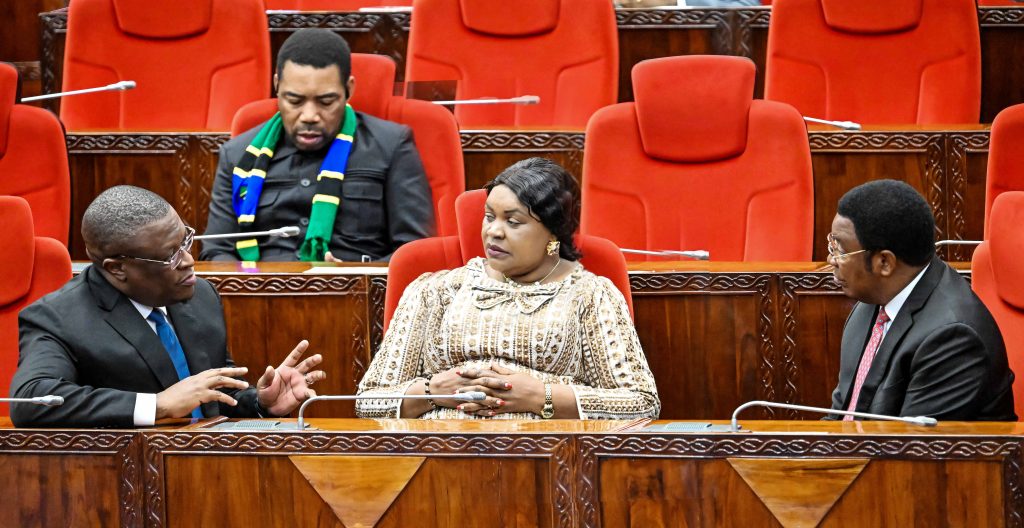 Waziri Mkuu Kassim Majaliwa akizungumza na Waziri wa Habari, Mawasiliano na Teknolojia ya Habari Nape Nnauye, bungeni Jijini Dodoma, Juni 11, 2024. Katikati ni Waziri wa Nchi, Ofisi ya Waziri Mkuu (Sera, Bunge na Uratibu) Jenista Mhagama. (Picha na Ofisi ya Waziri Mkuu)