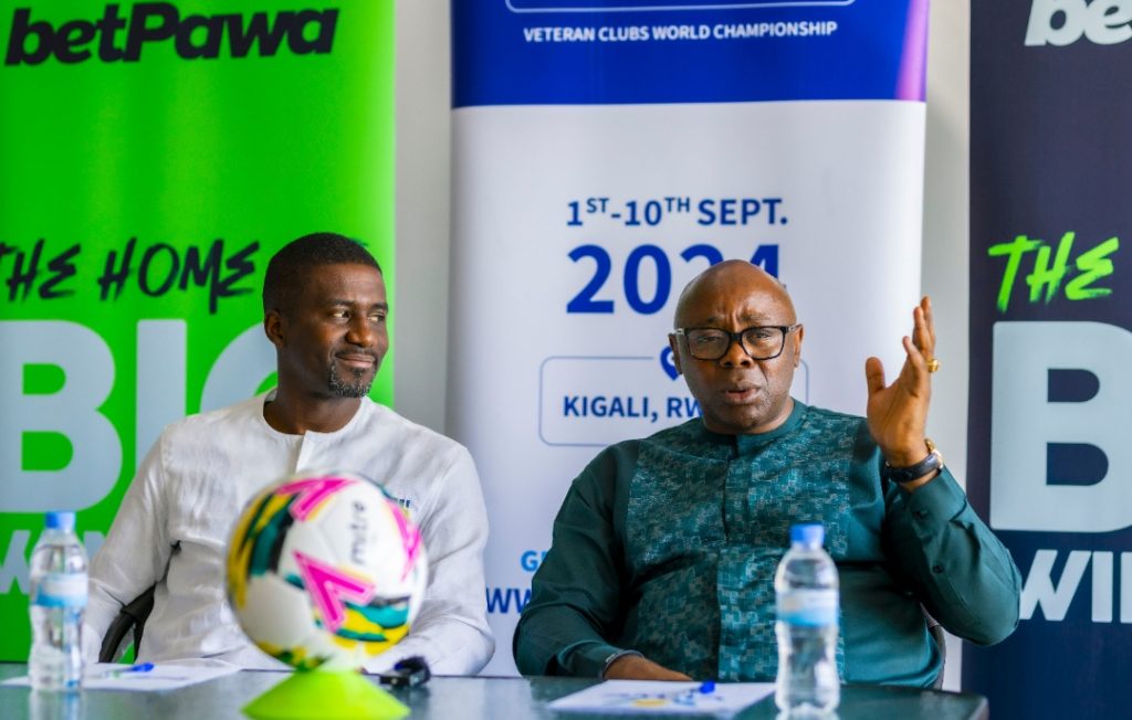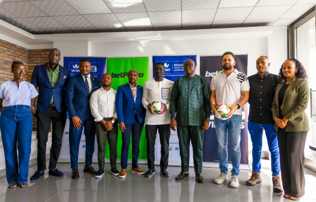 Afisa Mkuu wa Biashara wa betPawa, Ntoudi Mouyelo akizungumza wakati wa kutangaza udhamini wa mashindano ya klabu bingwa ya dunia kwa wachezaji maveterani (VCWC) yaliyopangwa kufanyika mjini, Kigali, Rwanda kuanzia Septemba 1 mpaka 10.