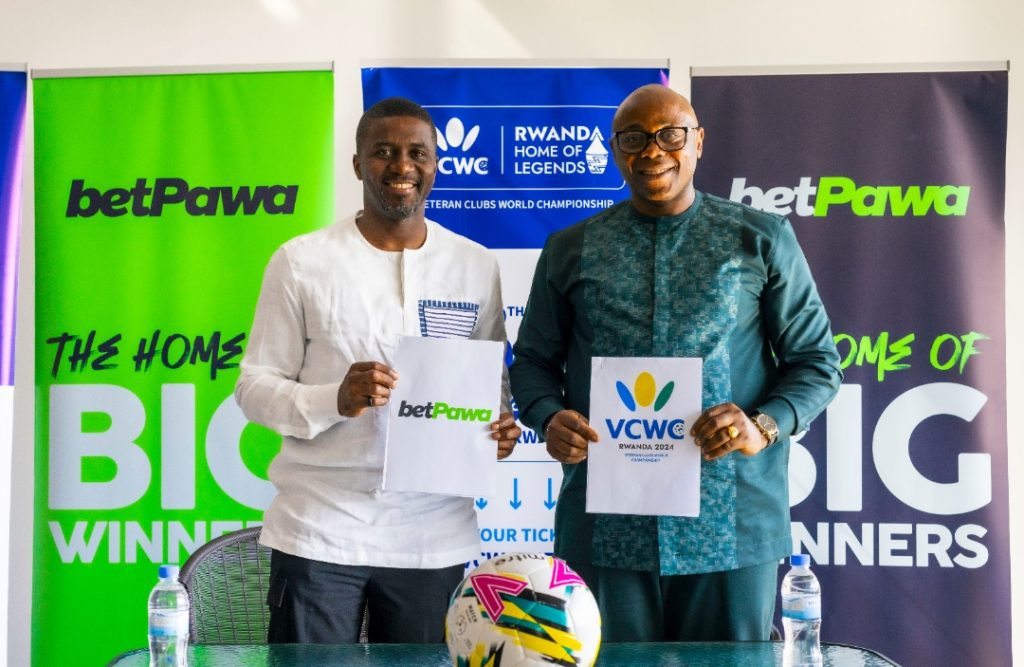Mwanzilishi wa mashindano ya klabu bingwa ya dunia kwa wachezaji maveterani (VCWC) Fred Siewe (kulia) na Afisa Mkuu wa Biashara kampuni ya michezo ya kubashiri ya betPawa, Ntoudi Mouyelo wakionyesha nakala za mikatana mara baada ya kusainiwa kwa ajili ya kudhamini mashindano hayo.